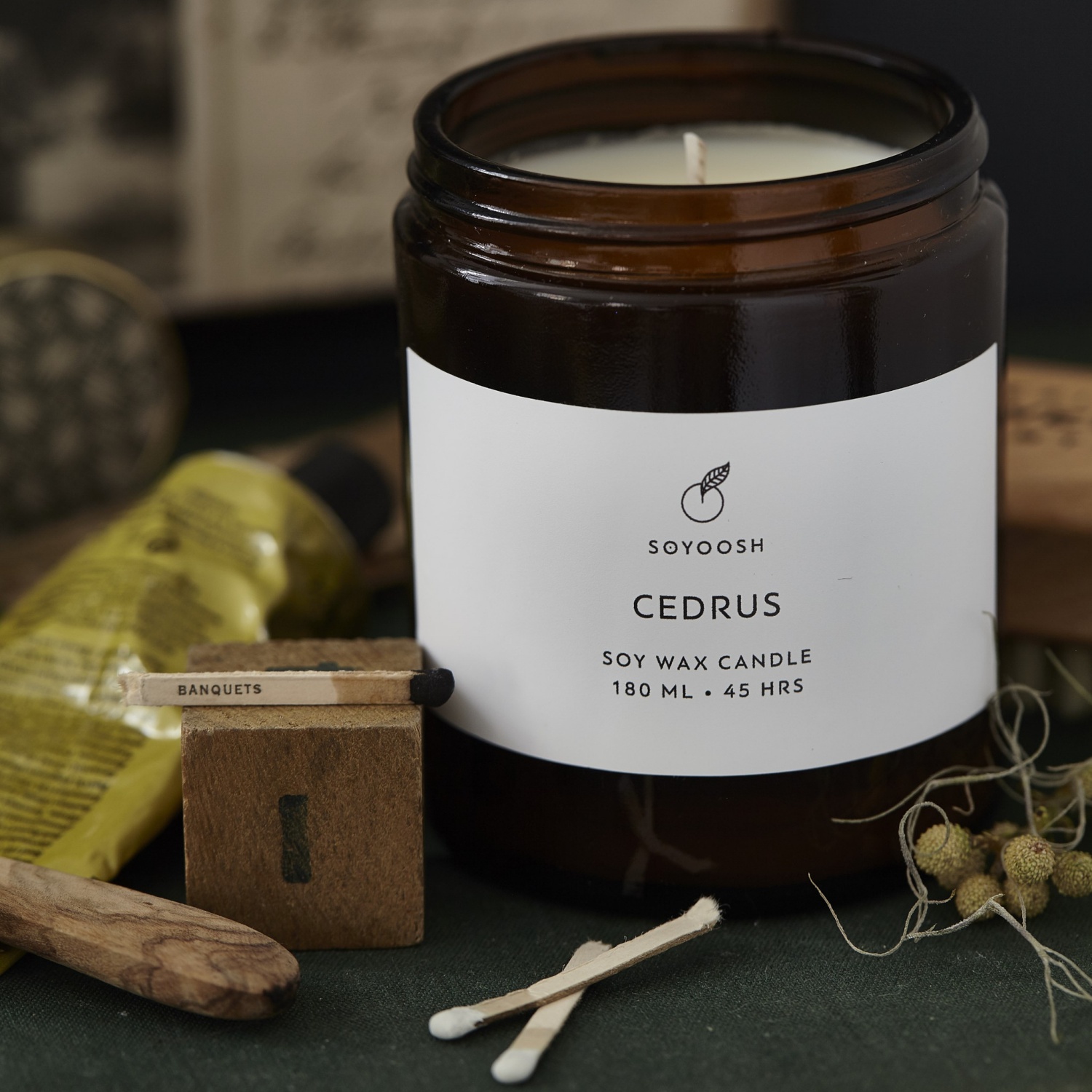 ŚWIECA SOJOWA "CEDRUS" o leśnym zapachu, Soyoosh, decodialogue.pl