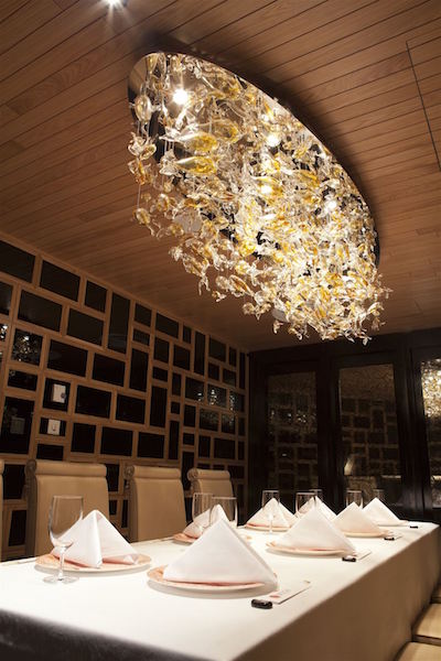 • Kompozycja szklano-świetlna nad stołem w jadalni, wykonana z ręcznie formowanych, kolorowych elementów szklanych