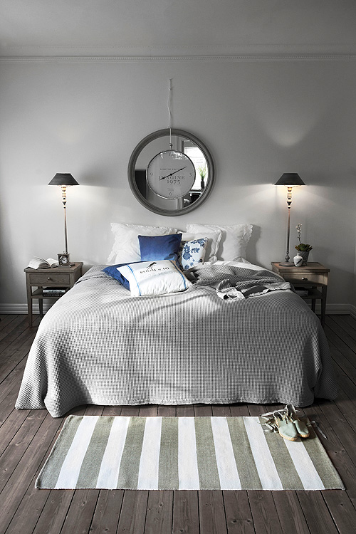 Zegar Clotilde, 895 zł; lampy z kolekcji Tinne, 945 zł/szt.; stoliki nocne z dębu, 1858 zł/szt.; poduszki od 149 zł, Lene Bjerre, Wonder home