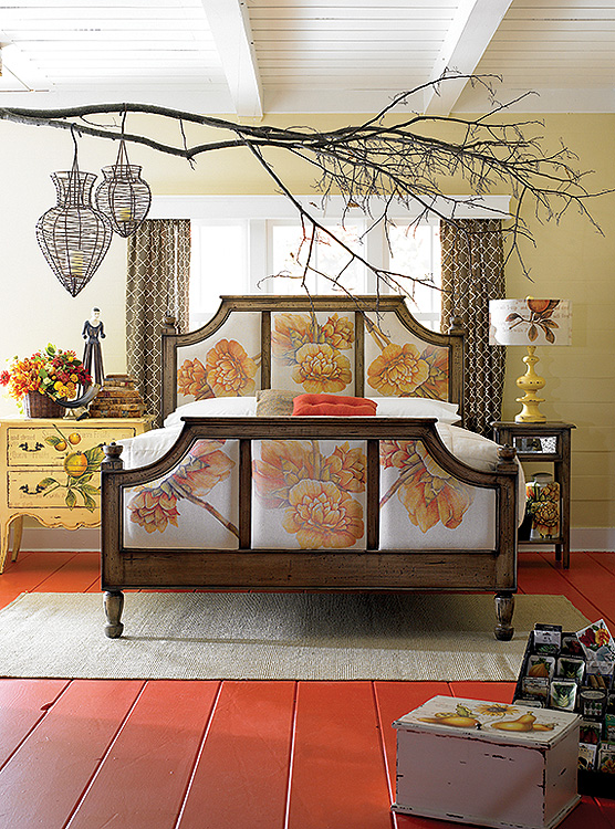 Jak w ogrodzie – łóżko z nadrukami na naturalnym lnie Antoinette queen, 8372 zł komoda, 2996 zł stolik