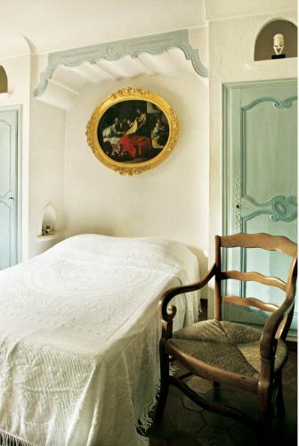 Sypialnie zdobi obraz w złotej ramie.