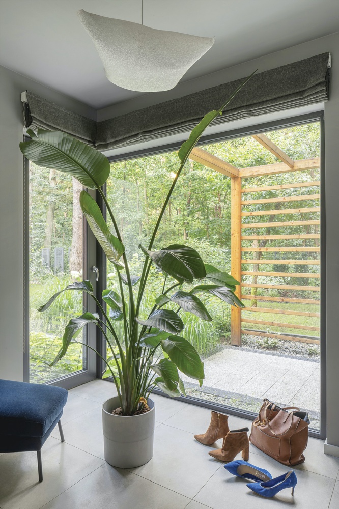 Pierwsza była działka, dom musiał się do niej dopasować. Ma modrzewiową elewację i ogromne okna, przez które, niczym w telewizorze, Karolina, Kuba i ich synek Bruno oglądają niekończący się serial… z życia lasu.