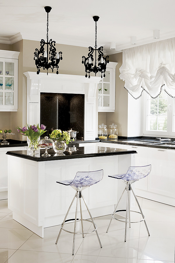 Lakierowane fronty mebli idealnie pasują do Granitu star galaxy. Hockery Ice - Calligaris.