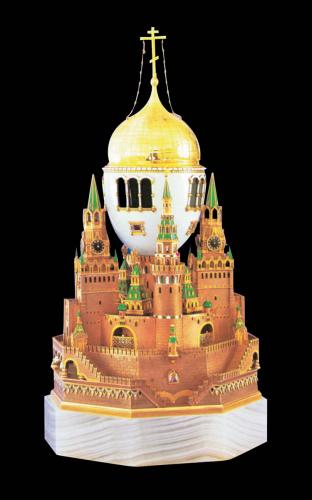 "Moskiewski Kreml". Jajo z pozytywką grającą hymn prawosławny. Dwie wieżyczki z czerwonego złota, z zegarami, wybijającymi godzinę, 1904 r.