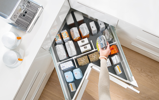 Szafki typu magic corner pozwalają w maksymalny sposób wkorzystać "ślepe narożniki", SPACE CORNER, Blum Zdjęcie: blum.com