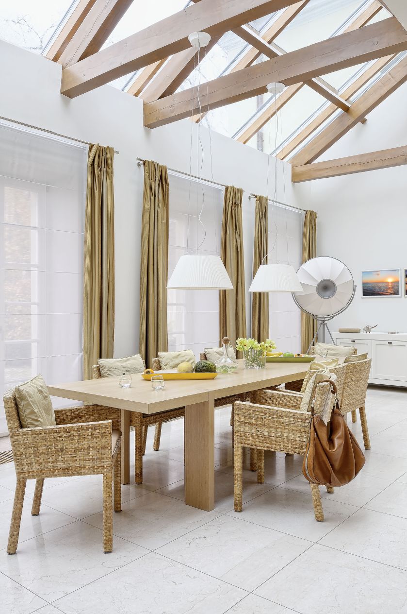Prawie setka okien z prawdziwymi drewnianymi szprosami, dwa kilometry tkanin na zasłony, setka lamp i żyrandoli. Prawdziwy pałac, a jednak przytulny i kameralny.   Popijamy cappuccino w oranżerii Gdyby nie typowo polska wiosenna pogoda, można by mieć wrażenie, że siedzimy w najprawdziwszym palazzo. Za oknem platany i krzewy różane otoczone bukszpanami. Wokół współczesna klasyka, czyli głównie włoszczyzna: Minotti, Gervasoni, Zanotta. Nie gryzie się z tą p