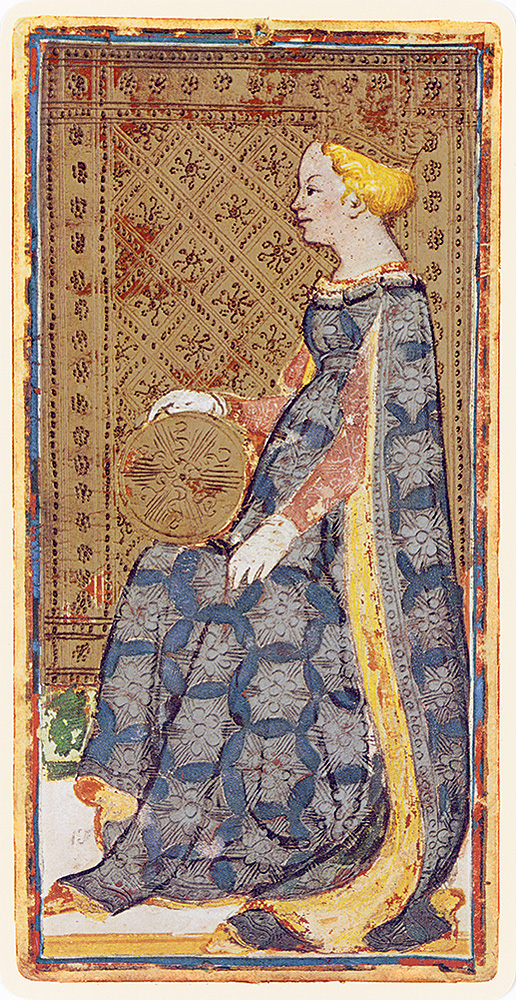 Królowa Denarów i Pięć Monet, karty tarota należące do Francesca Sforzy i Bianki Marii Visconti, 1441-1447 r.