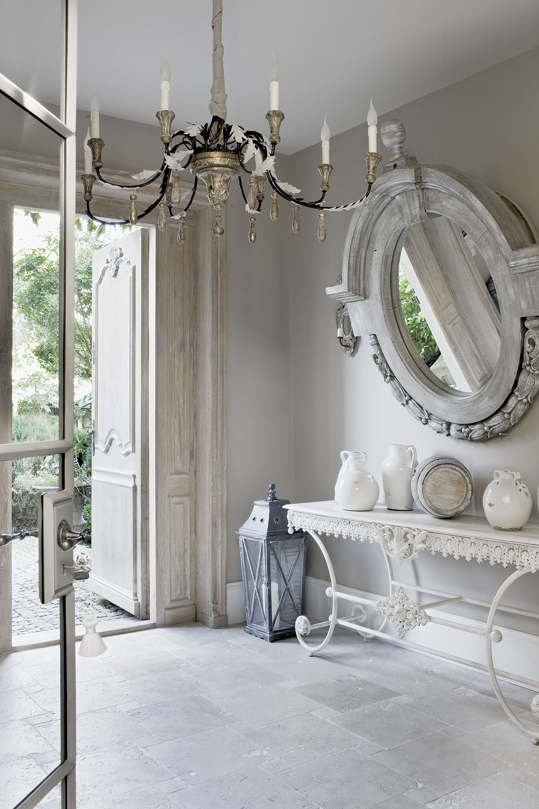 Obowiązkowa dekoracja: lustro i kryształowy żyrandol.
