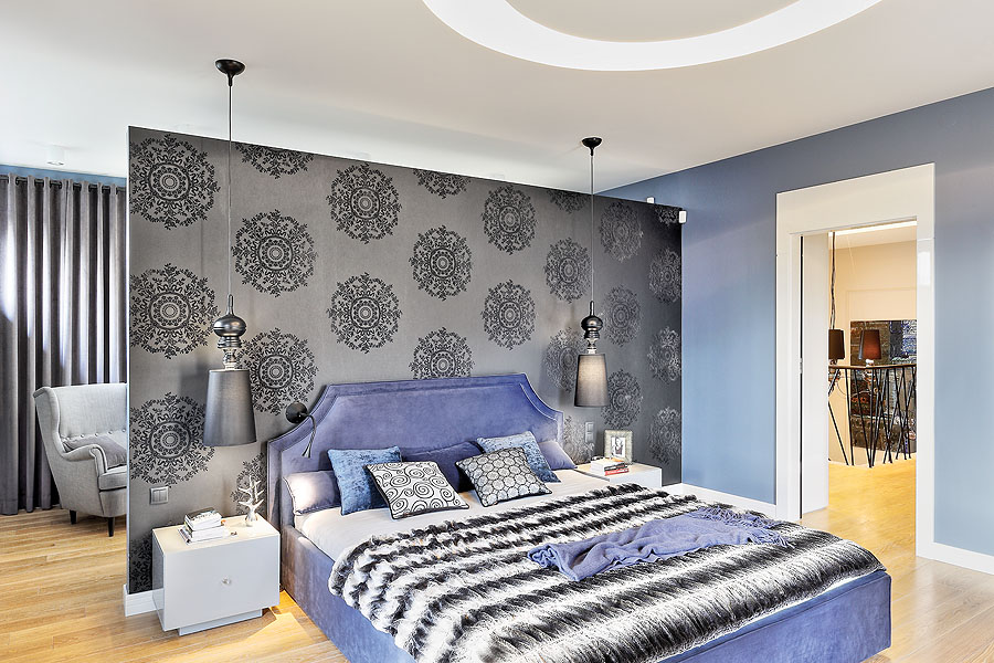 Sypialnia w stylu glamour: welurowa tapeta, łóżko z wysokim zagłówkiem, nowoczesne lampy.