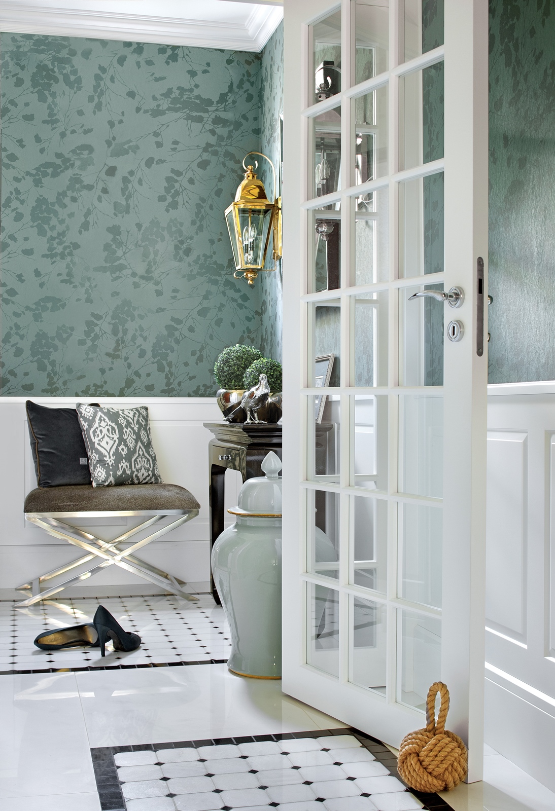 Tapeta marki Flugger z wzorem liści brzozy nie jest przypadkowa – pasuje do drzew, które widać za oknem. Siedzisko,
