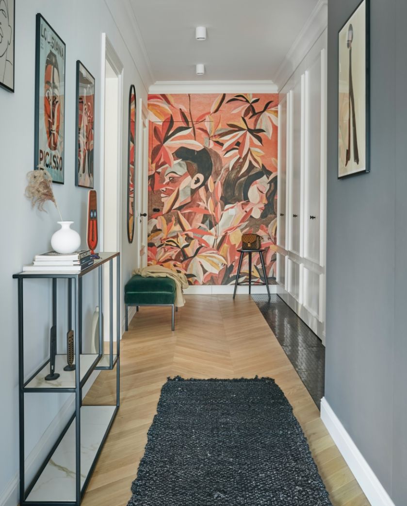 Apartament na Starej Ochocie urządzony w eklektycznym stylu – 110-metrowe mieszkanie ze szmaragdowymi akcentami i grafikami Nikodema Szpunara