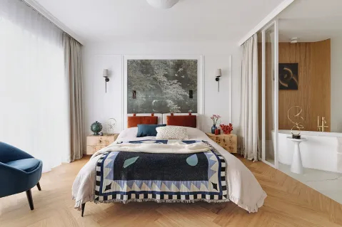 Eleganckie mieszkanie z błękitnymi drzwiami – urządzone „hotelowo” wnętrze sprzyja odpoczynkowi