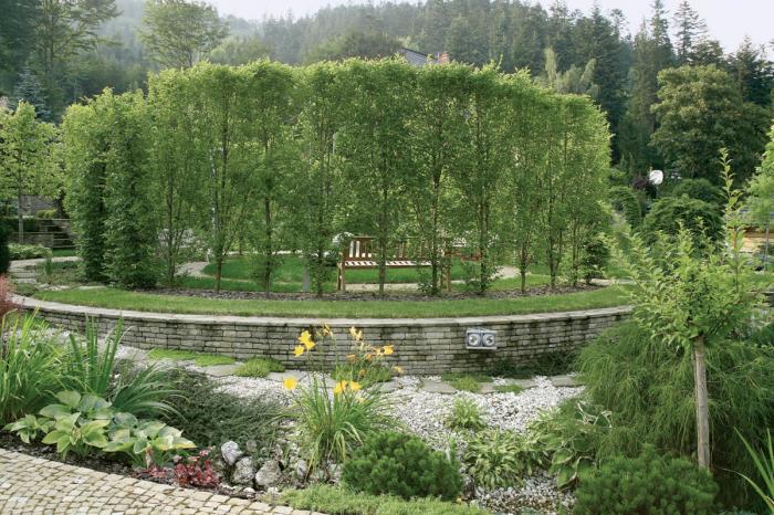 • W dolnej części ogrodu kolisty salon otoczono wysokimi strzyżonymi grabami.