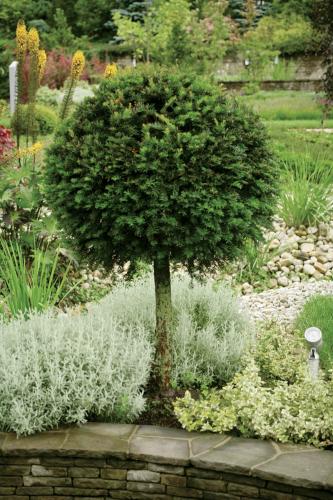 • W górskim ogrodzie dużą rolę pełnią rośliny zimozielone- strzyżone żywopłoty z cisa, świerki, sosny i bluszcze.