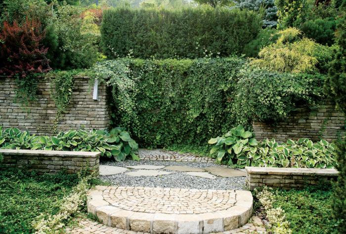 • W dolnej części ogrodu kolisty salon otoczono wysokimi strzyżonymi grabami.