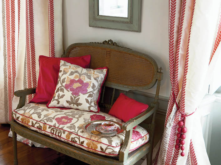 • Zasłona to bawełna drukowana (530 zł/m.b.), na fotelu jedwab z domieszką poliestru (406 zł/m), kolekcja