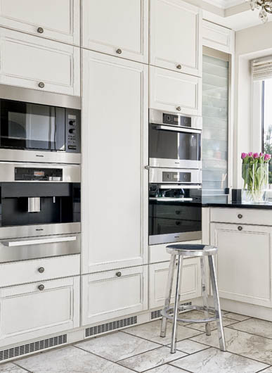 • Kuchnia biało-czarna, z czarnym kamieniem na blatach, symetryczna, do samego sufitu.