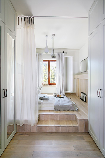 • Dwie obudowane drewnem ściany - za łóżkiem i po przeciwnej stronie - kryją schowki oraz toaletkę. Nad nimi wiszą