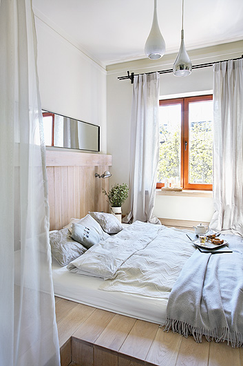 • Dwie obudowane drewnem ściany - za łóżkiem i po przeciwnej stronie - kryją schowki oraz toaletkę. Nad nimi wiszą