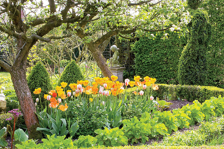 • Kompozycje tulipany wśród bukszpanów. Ogród pełen nastrojowych zakątków.