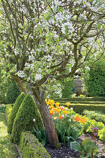 • Kompozycje tulipany wśród bukszpanów. Ogród pełen nastrojowych zakątków.