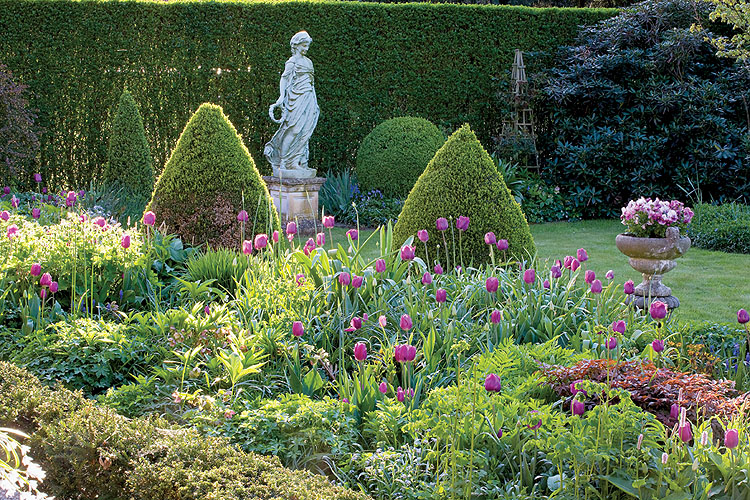 • Kompozycje tulipany wśród bukszpanów. Ogród pełen nastrojowych zakątków.