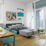 • Nowoczesne wnętrze z biało-turkusowym salonem