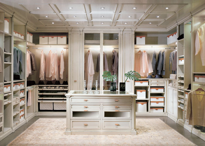 Wyspa nie tylko w kuchni. Tym razem stanęła w garderobie, gdzie zawsze przydadzą się dodatkowe półki i szuflady. Meble zrobione są z litego orzecha włoskiego. ORIGINE ITALIA