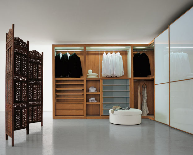 • Garderoba Ubi firmy Poliform. Na mocowanych do ściany panelach można dowolnie montować półki i szuflady.