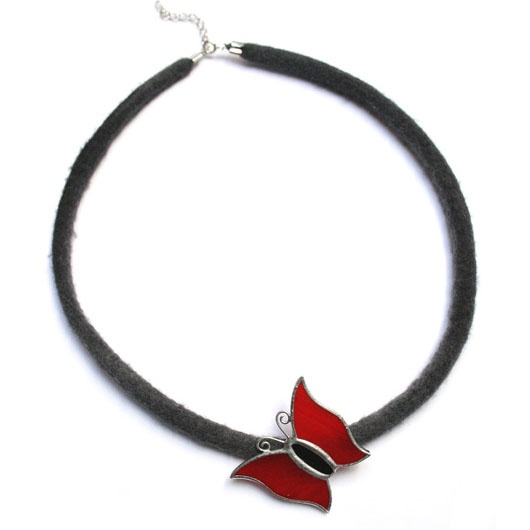 Naszyjnik Odpoczywający motyl z ręcznie robionego filcu i witrażu. Dooperelle.pl