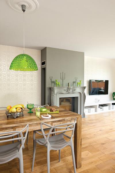 Nowoczesna lampa, drewniany skandynawski stół i stylowy kominek. Zdjęcia: Joanna Siedlar, Stylizacja: Kasia Mitkiewicz