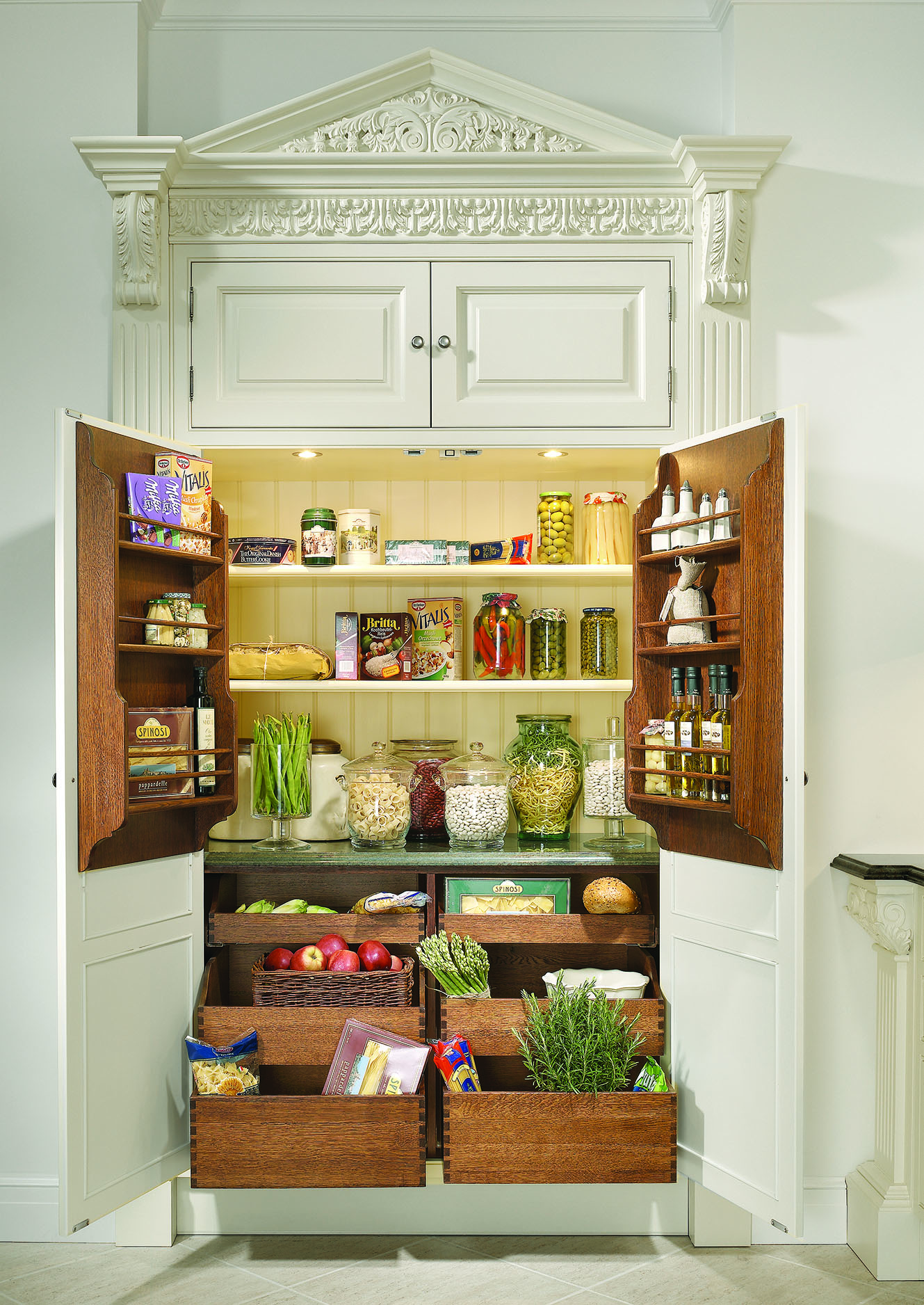 • Klasyczna spiżarnia ukryta za drzwiami zrobionymi na wzór kuchennych frontów, aranżacja