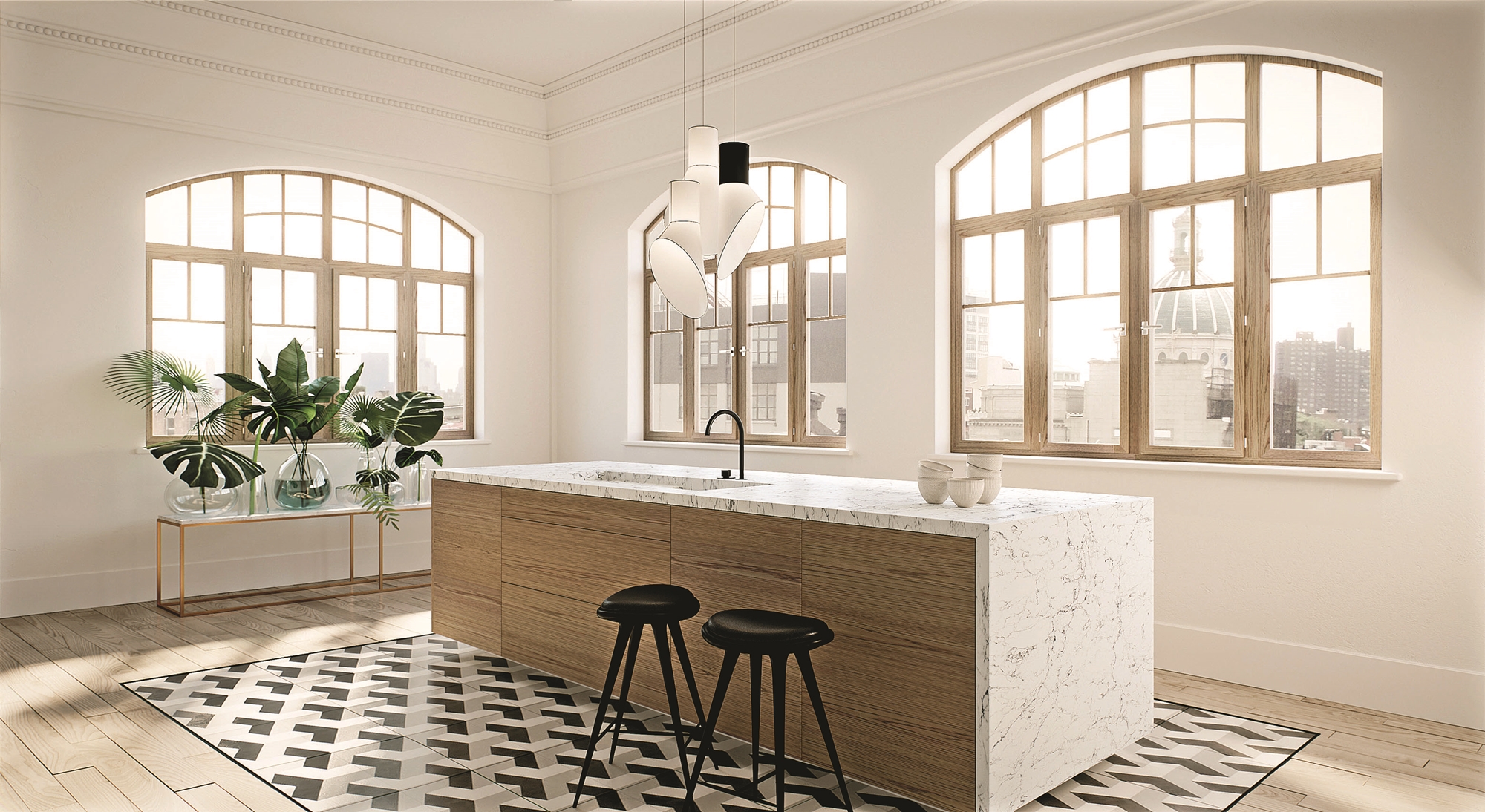 WHITE ATTICA, rodzaj kwarcogranitu marki CaesarStone, z którego zrobiono blat i boczne ścianki wyspy, jest odporny na zarysowania, M+Q POLSKA, mqpolska.pl