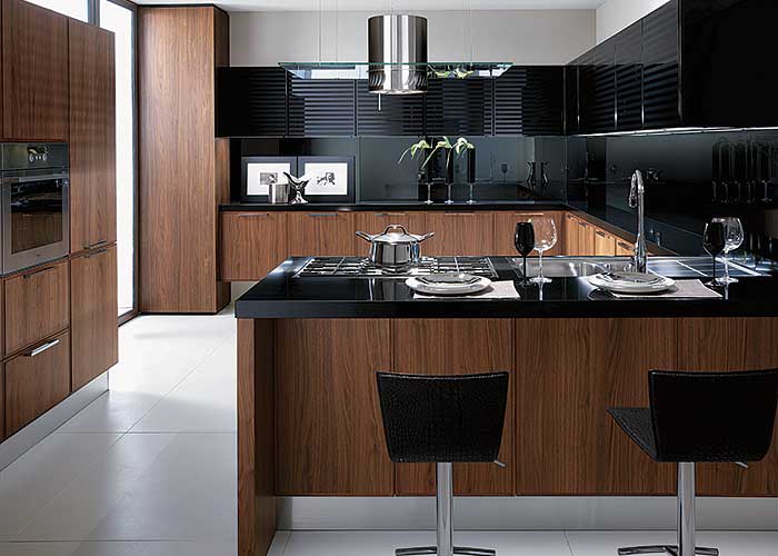 • Zgrany duet. Dekoracyjne drewno orzecha włoskiego w kolorze Canaletto ładnie wygląda z czarnymi blatami - mogą być matowe lub