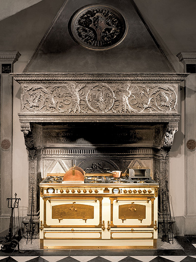 Kuchnia Restart (dwie płyty gazowe i dwa piekarniki) ze stali, mosiądzu i miedzi. Dodatki: grill i piec do pizzy, Art de Vivre