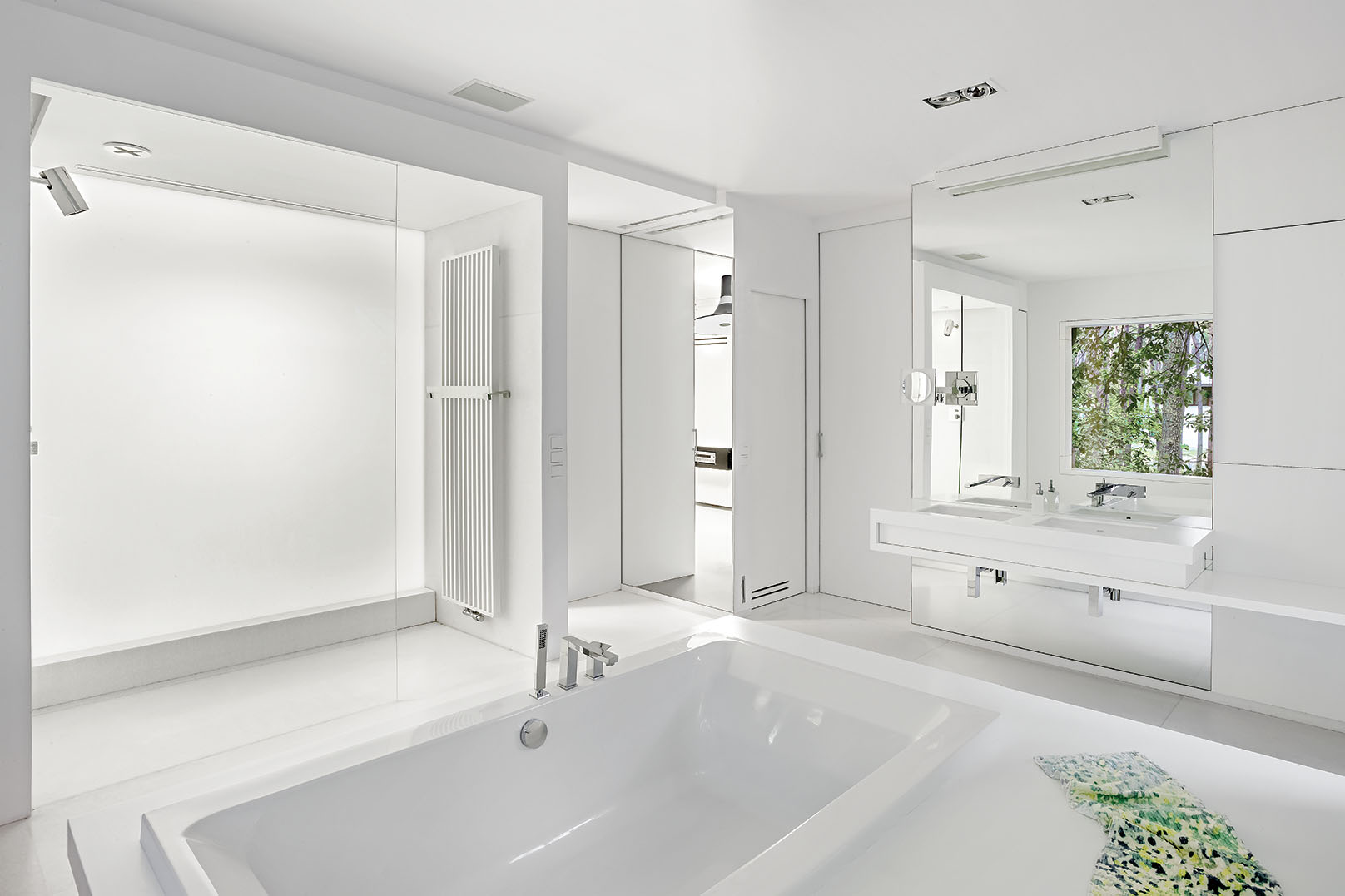 • Wanna w salonie z panoramicznym oknem zyskała corianową obudowę, która służy jako miejsce do wypoczynku,