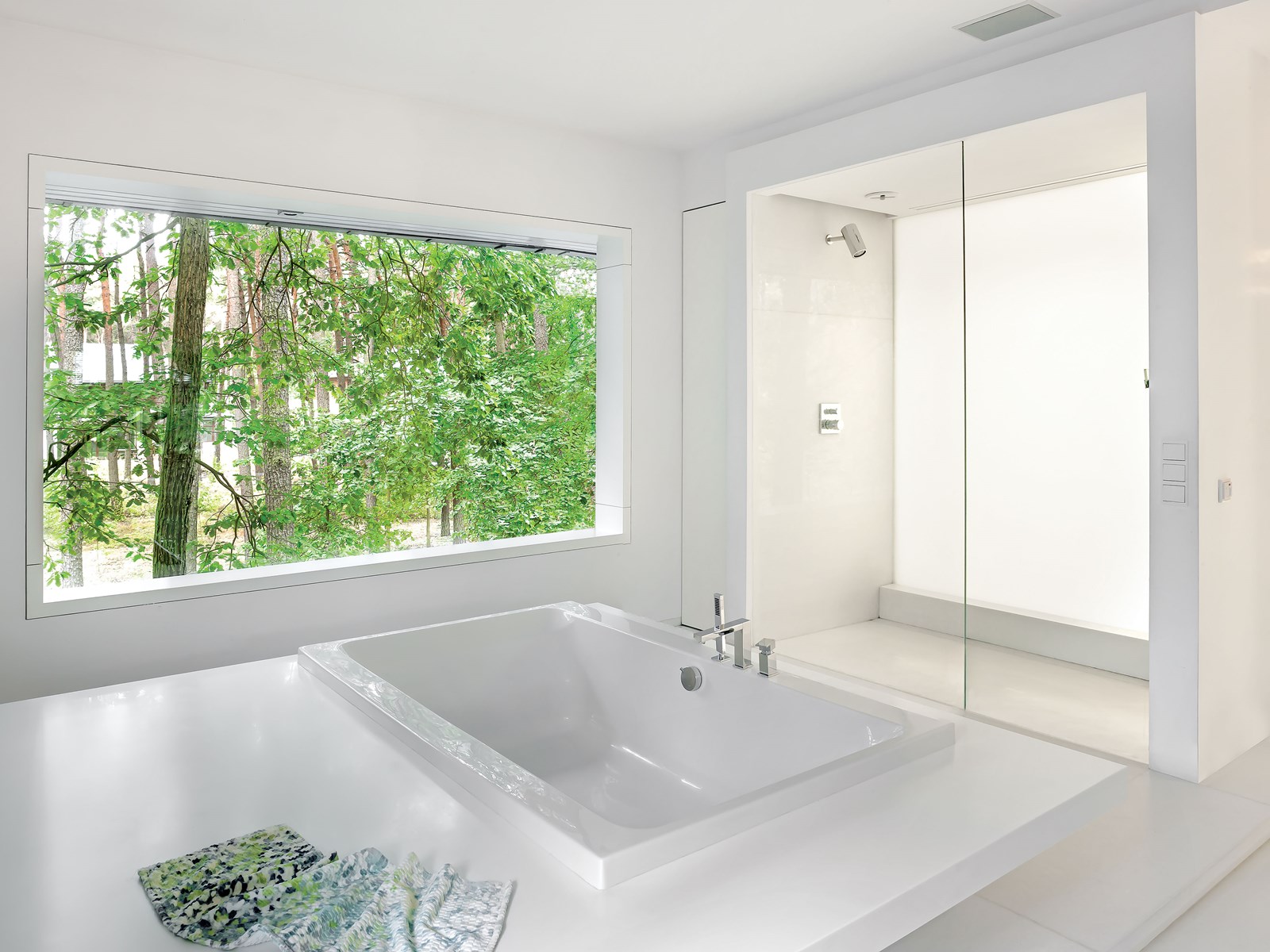 • Wanna w salonie z panoramicznym oknem zyskała corianową obudowę, która służy jako miejsce do wypoczynku,