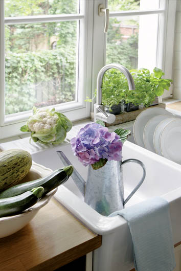 • Świeże zioła w doniczkach na parapecie i warzywa i kwaty hortensji - ulubienicy pani domu.