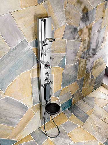 Panel prysznicowy z... siedziskiem ? dla tych, którzy łatwo się męczą. Może być zamontowany na ścianie lub w narożniku. Cena - około 4800 zł. MAX-FLIZ