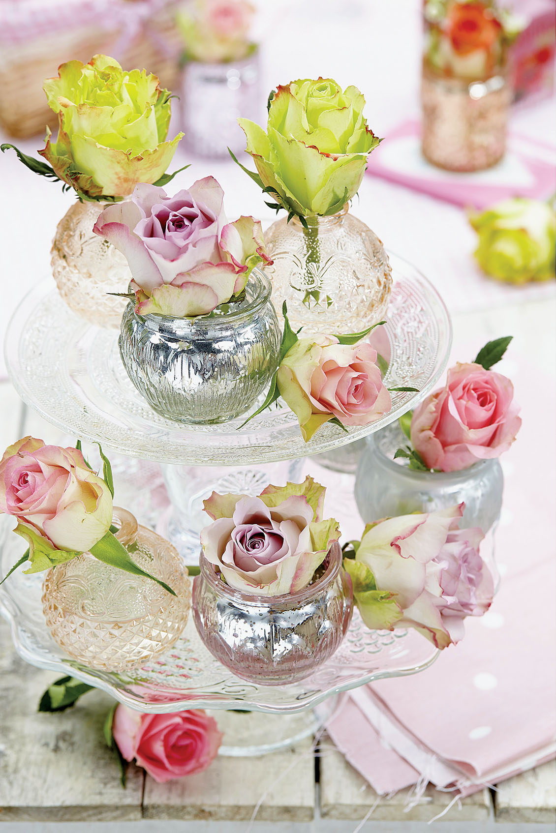 • Etażerka z pastelowymi różami wygląda równie słodko, jakby ułożono na niej praliny.