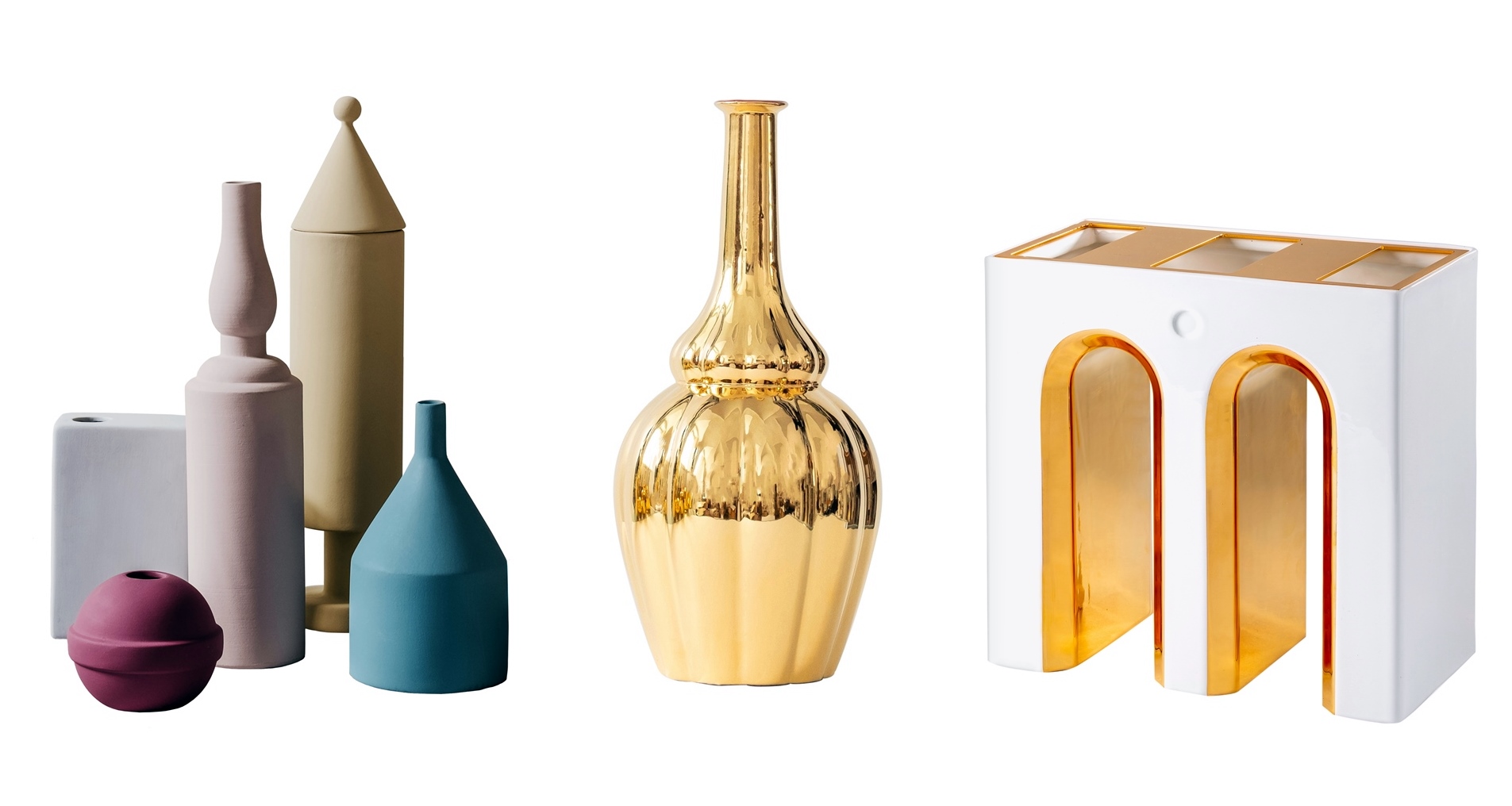 Od lewej: wazony Natura morta 5 i wazon Bianca Gold, Sonia Pedrazzini; wazon Massimo Gold, LatoxLato, artemest.com