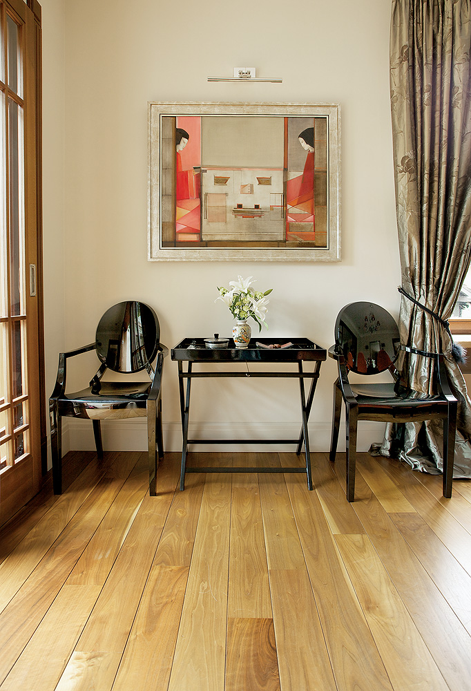 Najdłużej wyczekiwany obraz Sylwii Szafert, a pod nim zaprojektowany przez właścicielkę stolik pokryty laką i tradycyjnymi japońskimi malowidłami. Krzesła od Kartella.