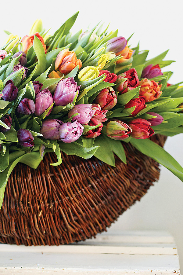 • Dekoracja z tulipanów w wiklinowym koszu.