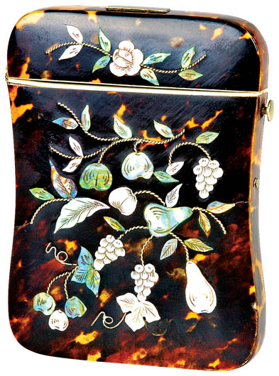 • Angielski wizytownik z masy perłowej dekorowanej skorupą żółwia, około 1860 r., z kolekcji Włodzimierza Hermana,
