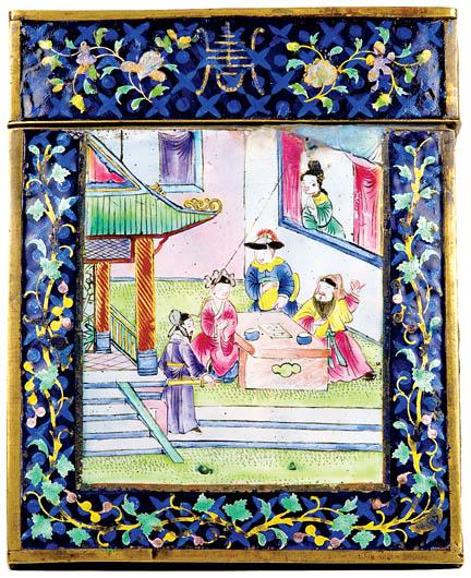 Wizytownik. Malowana porcelana (na obu stronach), oprawiona w brąz. Motywy spotykane na chińskich talerzach, ale w ogóle nieznane na wizytownikach, Chiny 1860-1890 r., z kolekcji Włodzimierza Hermana, fot. G. Kołodziej i J. Twardowski/JTFOTO.DK