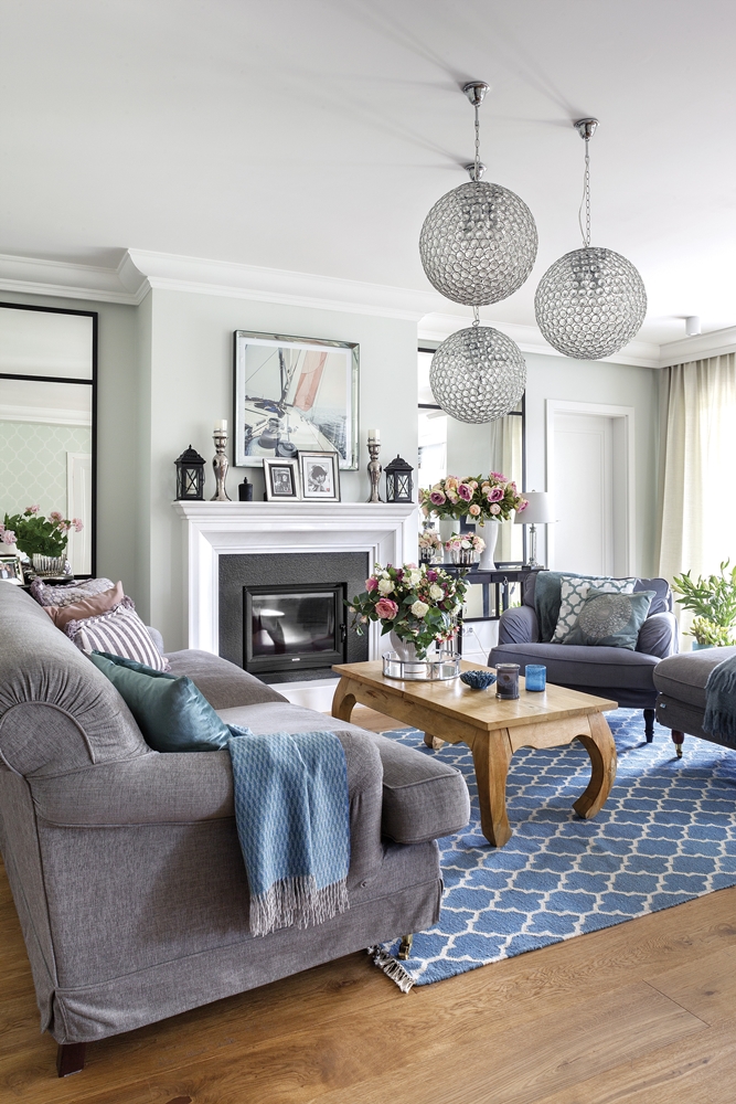 Aneta wymarzyła sobie dom do wygodnego życia, a nie tylko do podziwiania. Architektka zaproponowała styl hamptons i nowojorski w lekkim wydaniu – jasne szarości, błękity i biel połączone z dębowymi podłogami oraz delikatną sztukaterią.