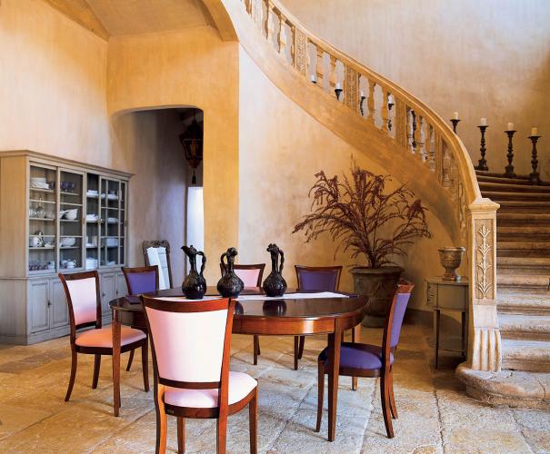 • Tradycyjny stół i nowoczesne krzesła z przedłużonym oparciem. HEBAN