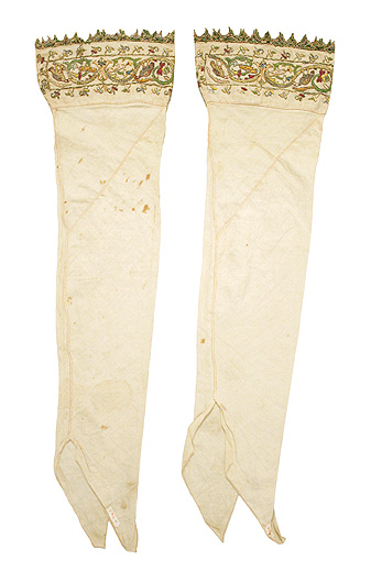 • XVI-wieczne włoskie pończochy lniane z jedwabnymi i metalowymi zdobieniami. The Metropolitan Museum of Art