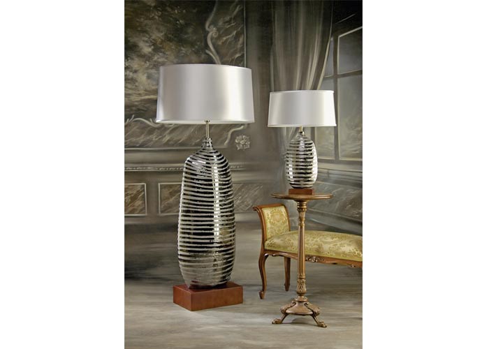 Lampy nie tylko świecą, mogą być także ozdobą. Tutaj uwagę zwraca efektowna perłowo-srebrna podstawa. Lampa podłogowa ma wysokość 164 cm, stołowa - 69 cm. PERS