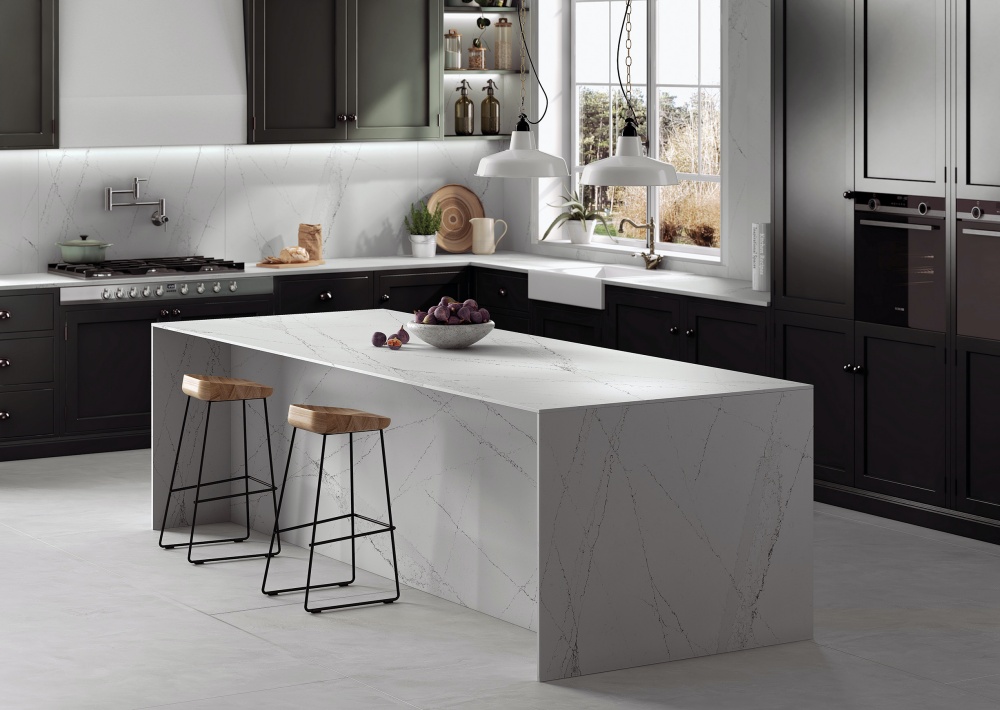 Wyspa kuchenna pokryta mineralnym hybrydowym materiałem Silestone Ethereal, który nadaje się do zastosowania na dużych powierzchniach, cosentino.com